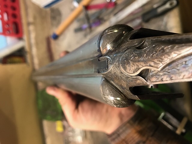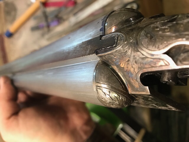 The 30" barrels are with Brian Dudley now and have been fit to the frame. I am having them choked IC/IM to compliment the Cyl/Mod on the original 26" barrels. Barrels still need ejectors done, rib matted, chokes, polishing, engraving, and bluing.