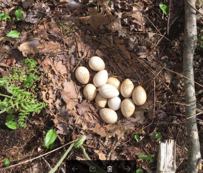 On the walk back to the truck we were treated to a sight I never grow tired of. She recoiled suddenly, shouting “There’s a turkey…” and I caught the head of a hen skulking through the heavy brush not 10 yards away. I had a hunch and told her to circle around and watch her every step. A minute later, she yells “OMG, here it is!” and there atop a mound of mossy grass it lay. Check it out boys, an even dozen! How cool is that?