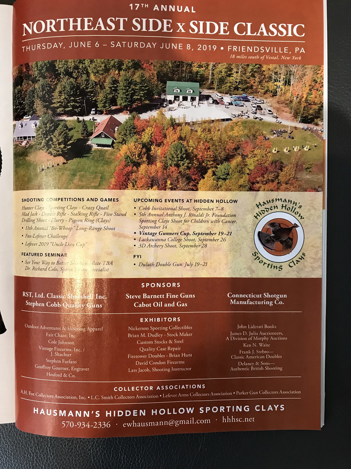 Here's a cell pic of the magazine advert for the upcoming Northeast Side by Side at Hidden Hollow in PA. This event is a MUST DO for those who are a few (or even many) hours drive and are into vintage side by side shotguns and in particular A H Fox guns. Here's where you can rub elbows with many of the Fox Fanatics. Check out the list of exhibitors who were signed up back in January; you won't find many of them at smaller SxS events. Buy-sell-trade. I see that our Fox Collectors Letterman Cup vintage SBT gun event was omitted, and that the Uncle Dan (Lefever) Cup is listed but it was moved up to the Southern SxS last month. Whatever, there are plenty of events and the shooting on Hidden Hollow's "grousey" sporting clays course is unequalled anywhere I've been.