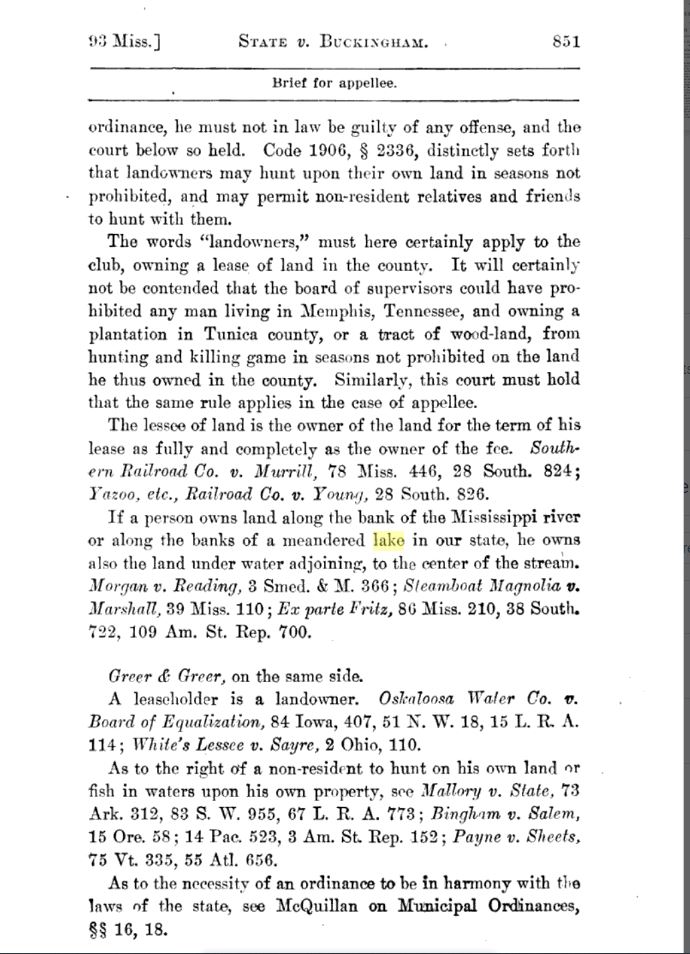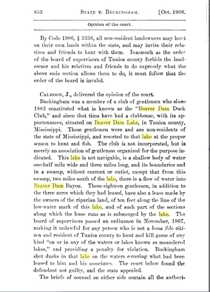 Re: Beaver Dam Club & 1909 MS Supreme Court Ruling