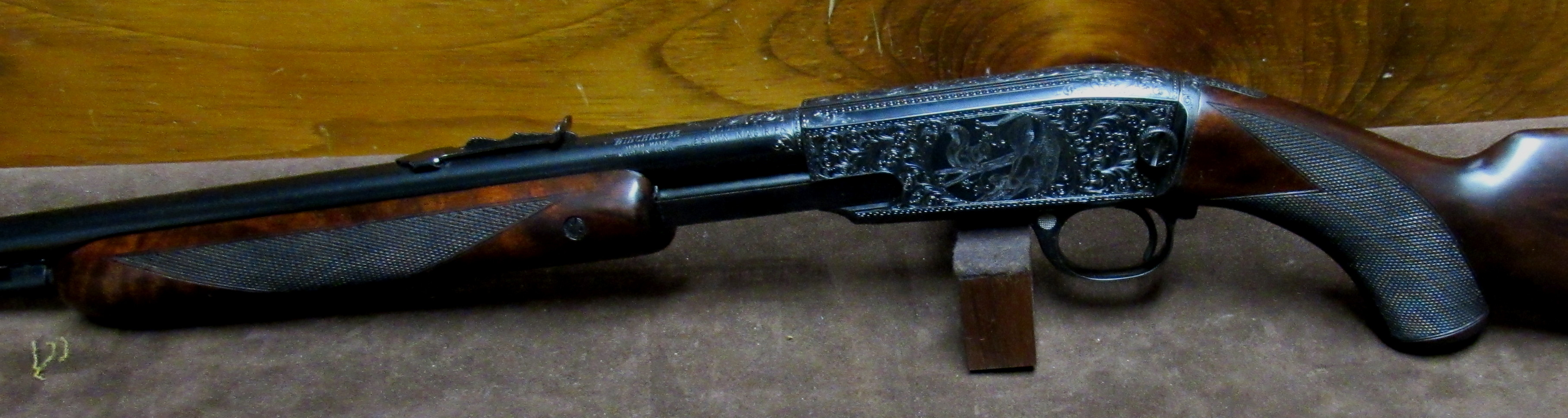 Here's some pictures of a Winchester Model 61 in .22 WMR by Jim. He restocked it with new wood, checkered and finished it. Engraved the metal parts and reblued them.