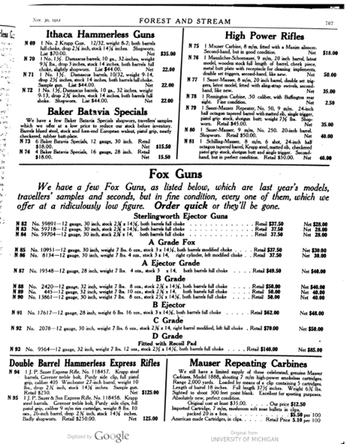 Friend "Fowlgunner" sent me a link to this page in the November 30, 1912, issue of Forest & Stream, part of a four-page SD&G ad. Interesting in that the A.H. Fox guns listing includes the serial numbers.