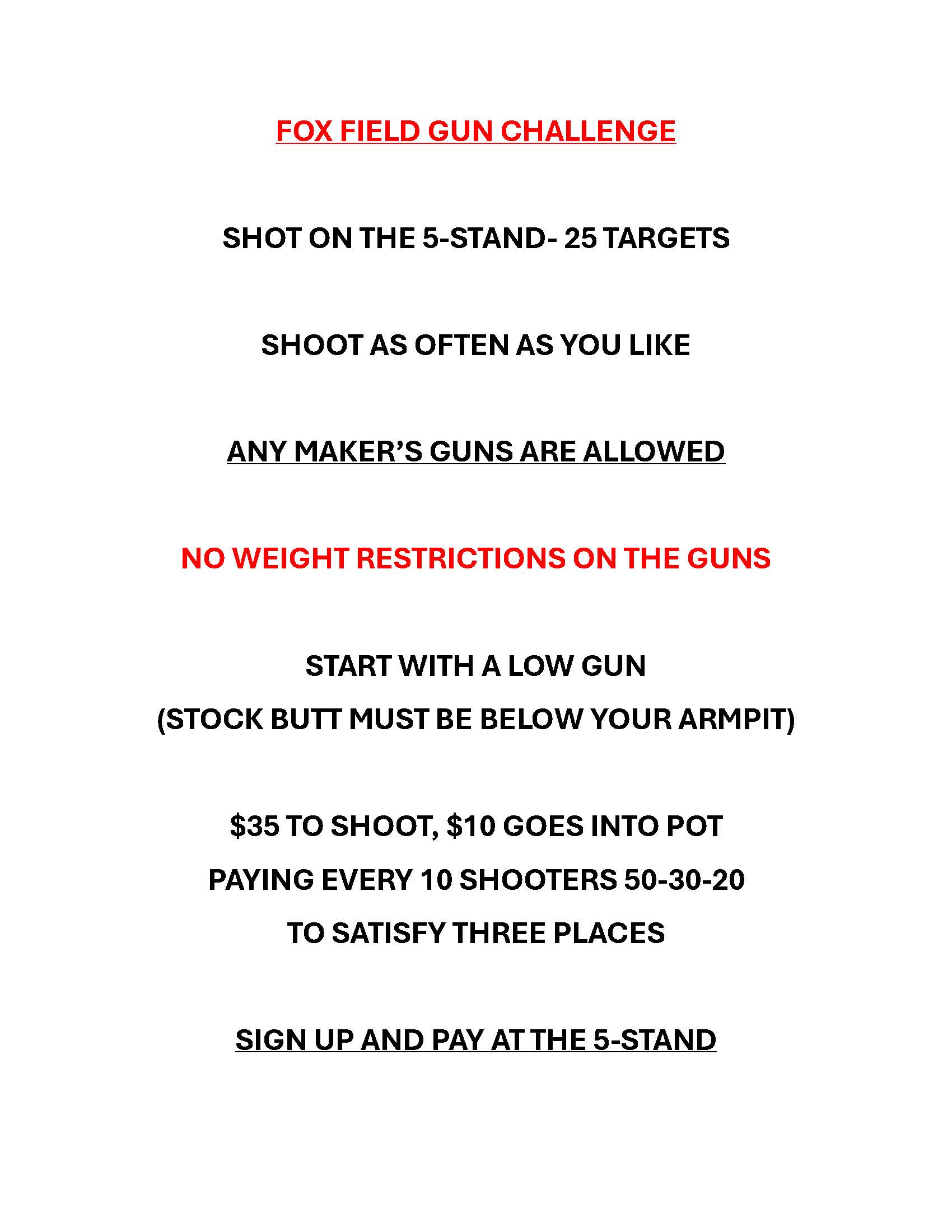 The Fox Field Gun 5-Stand is back in business this week. You can shoot it all day Thursday, shoot until 1:30 on Friday and until noon on Saturday (we have shoot-offs to run by 3:00). 25 targets, shoot any gun, no weight restrictions, start low gun (gun below armpit). $35 to shoot, $10 will go into the pot. We will pay out satisfying 3 places every 10 shooters $50-$30-$20.