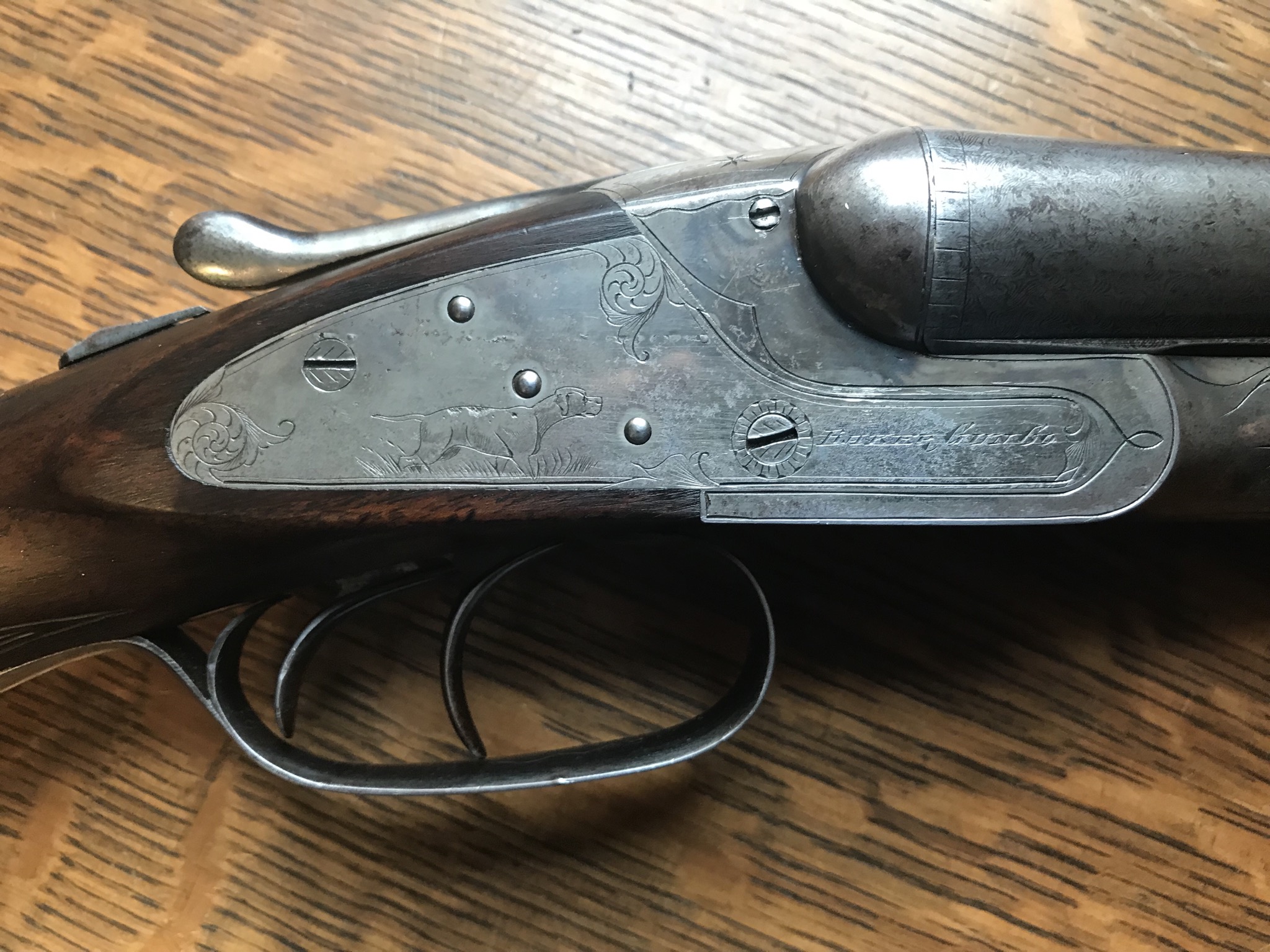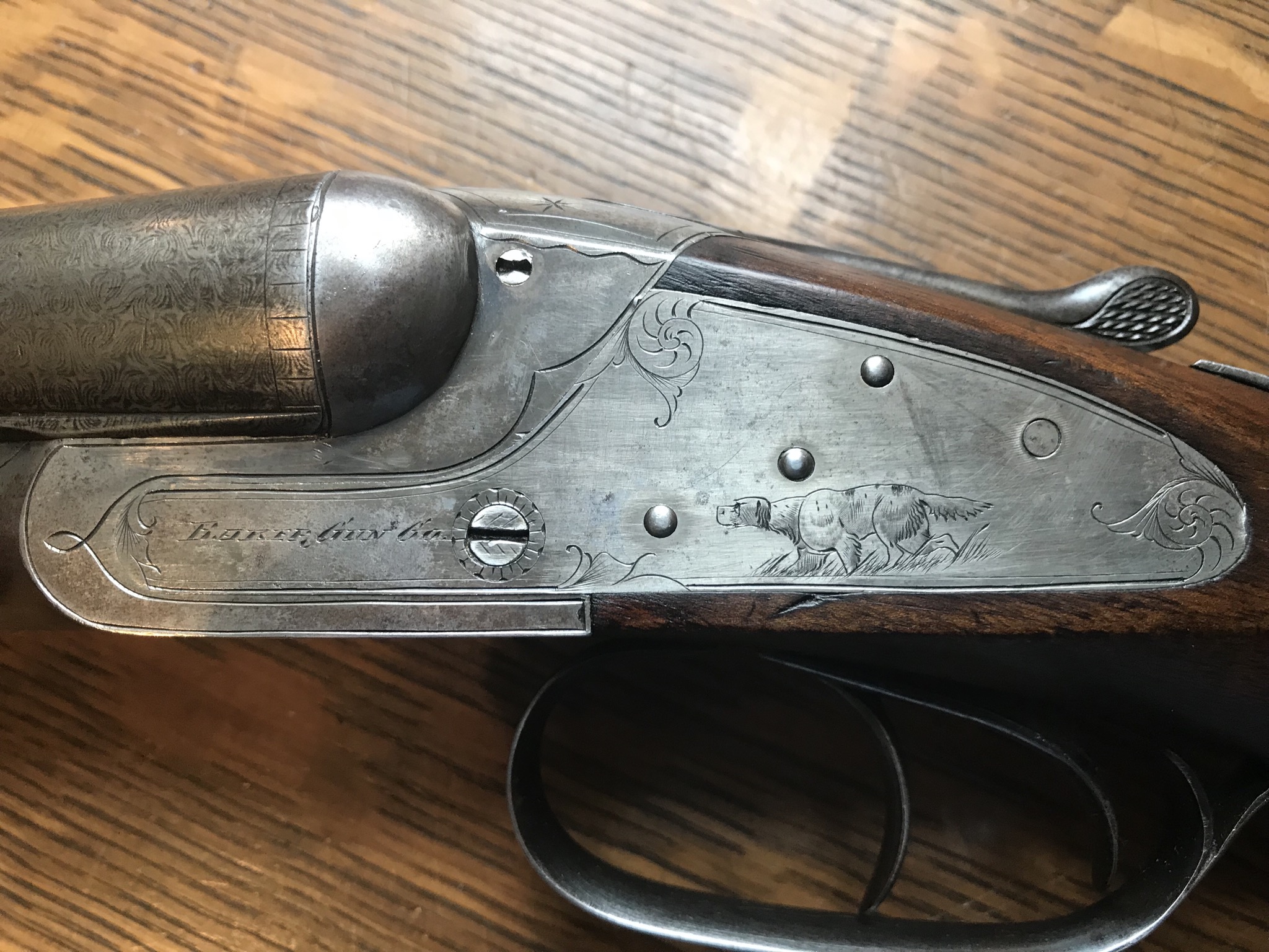 . I once read in Parker Pages that Parker always engraved a Setter on the right and a Pointer on the left (SRPL). The author referred to this as "Sir Pull". Unless my dog identification is incorrect, it appears that Baker chose the opposite scenario for their dogs, Setter on the left and Pointer on the right.