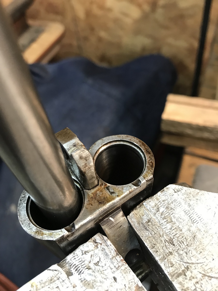 You'll see the reamer drive rod in each pic, note how it looks relative to the center of that chamber. My friend noticed that and got kind of edgy but those two pilots insure the choke is re-cut dead nuts on center of each bore out toward its muzzle. Kind of interesting to see how the centers of the chambers don't align with the bores at the chokes due to the “swamp” of the tubes. frank