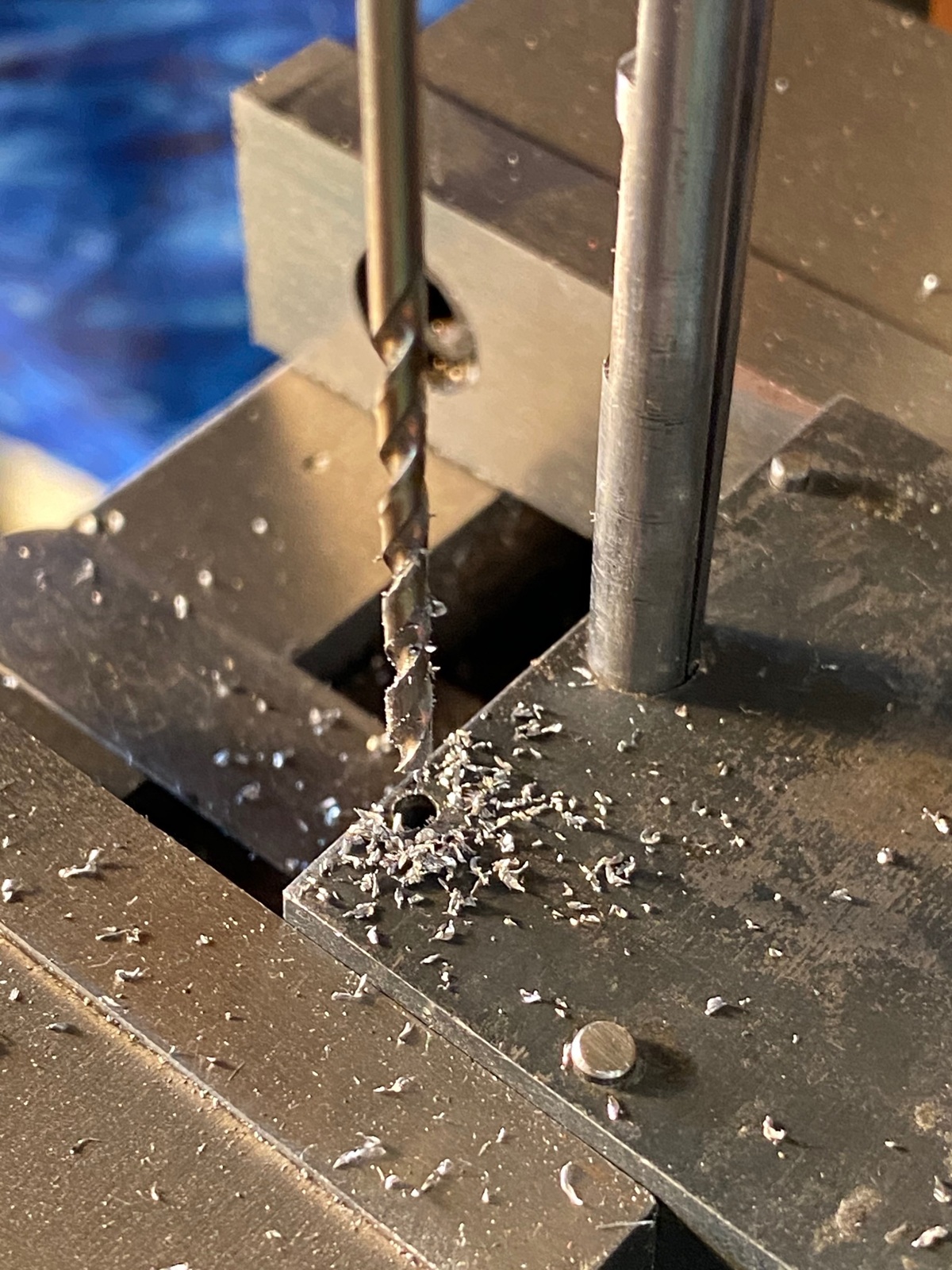 Using my jig to drill on the exact location of the broken pin; ejector stems are sticking up in this pic .
