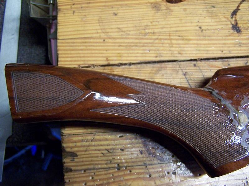 Further to Philip's post, here's a pic supplied by my friend Craig Libhart of Susquehanna Stockworks who's done a number of Foxes for me and knows how to get that "Foxy look" that often eludes other stock men. This broken one came off a Fox small bore that he restocked for a client. Original checkering matched with 22 LPI on the cheeks and on the wrist. Note also the proper wide border on the cheek panel. frank