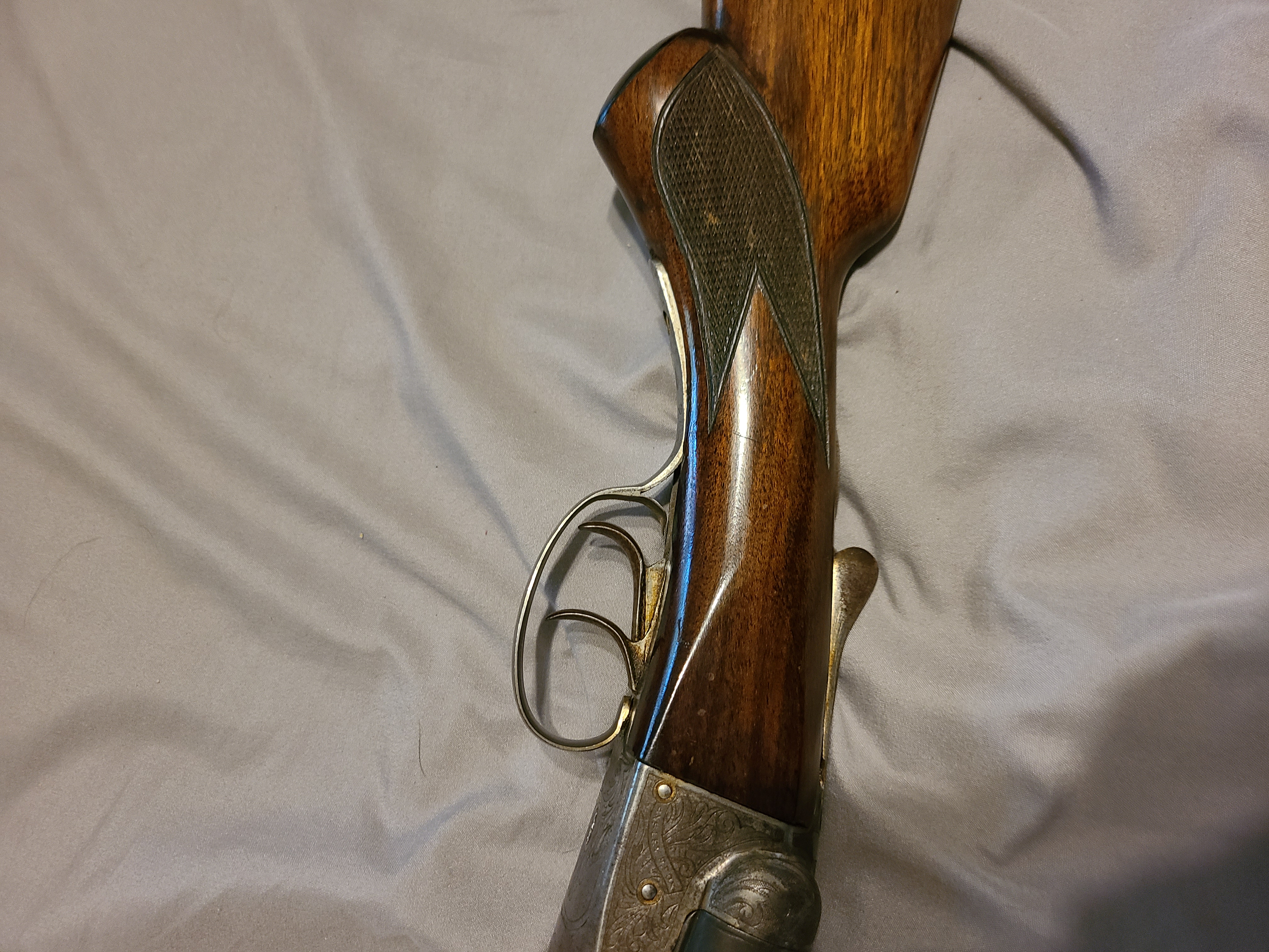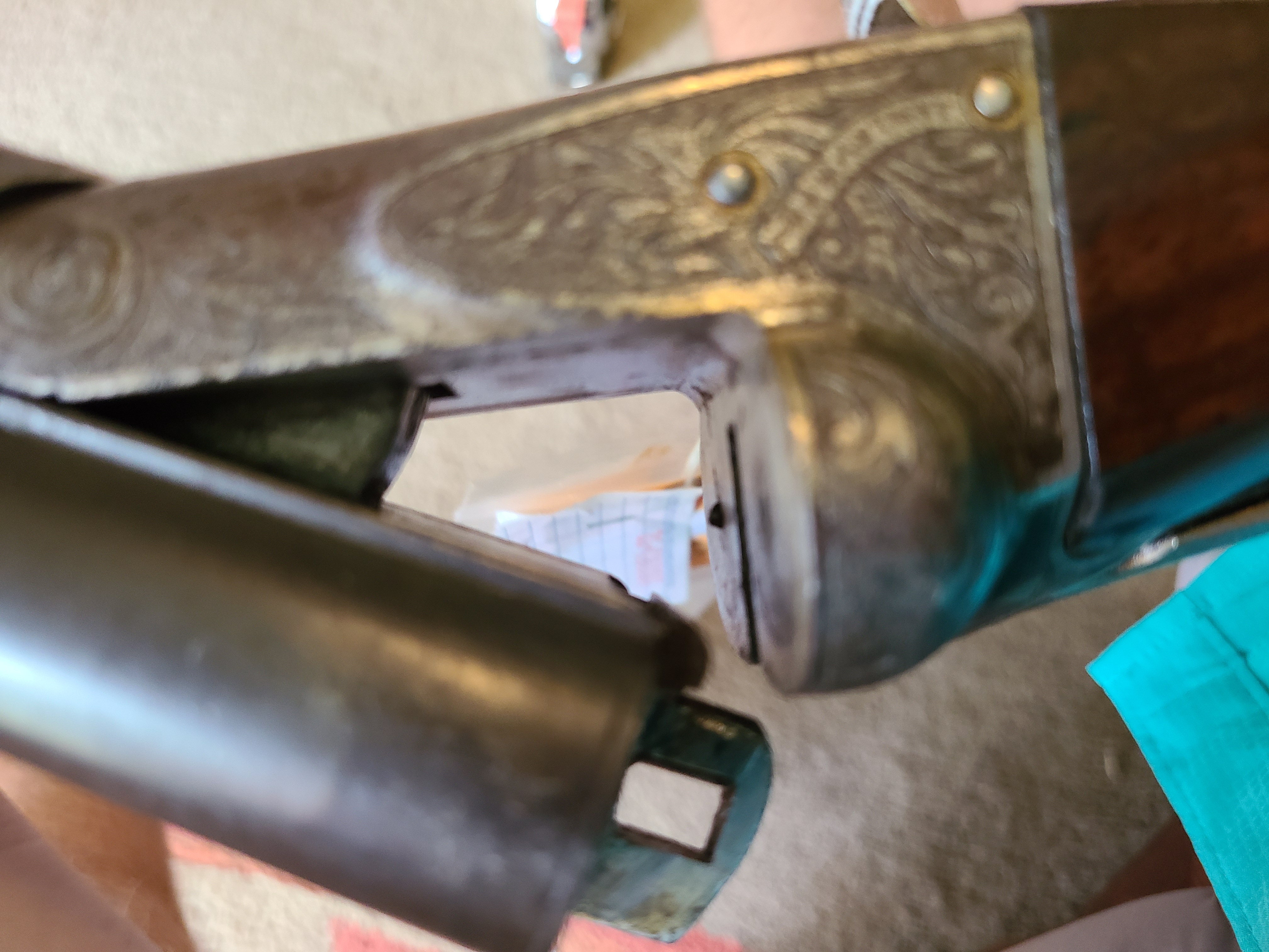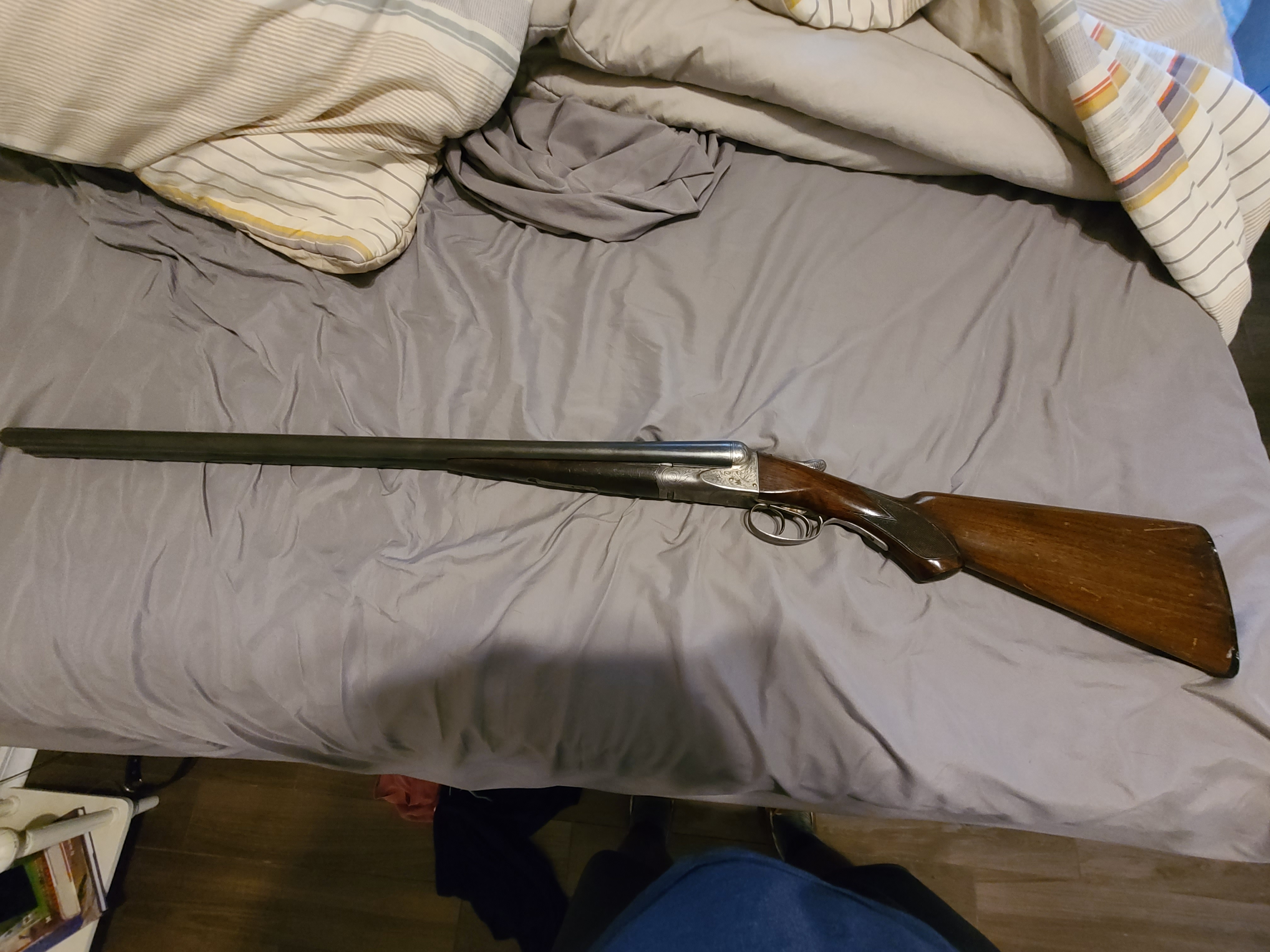 It looks like it's been restocked, barrels cut, pitted bores, maybe the chambers lengthened and the left hammer is broke.