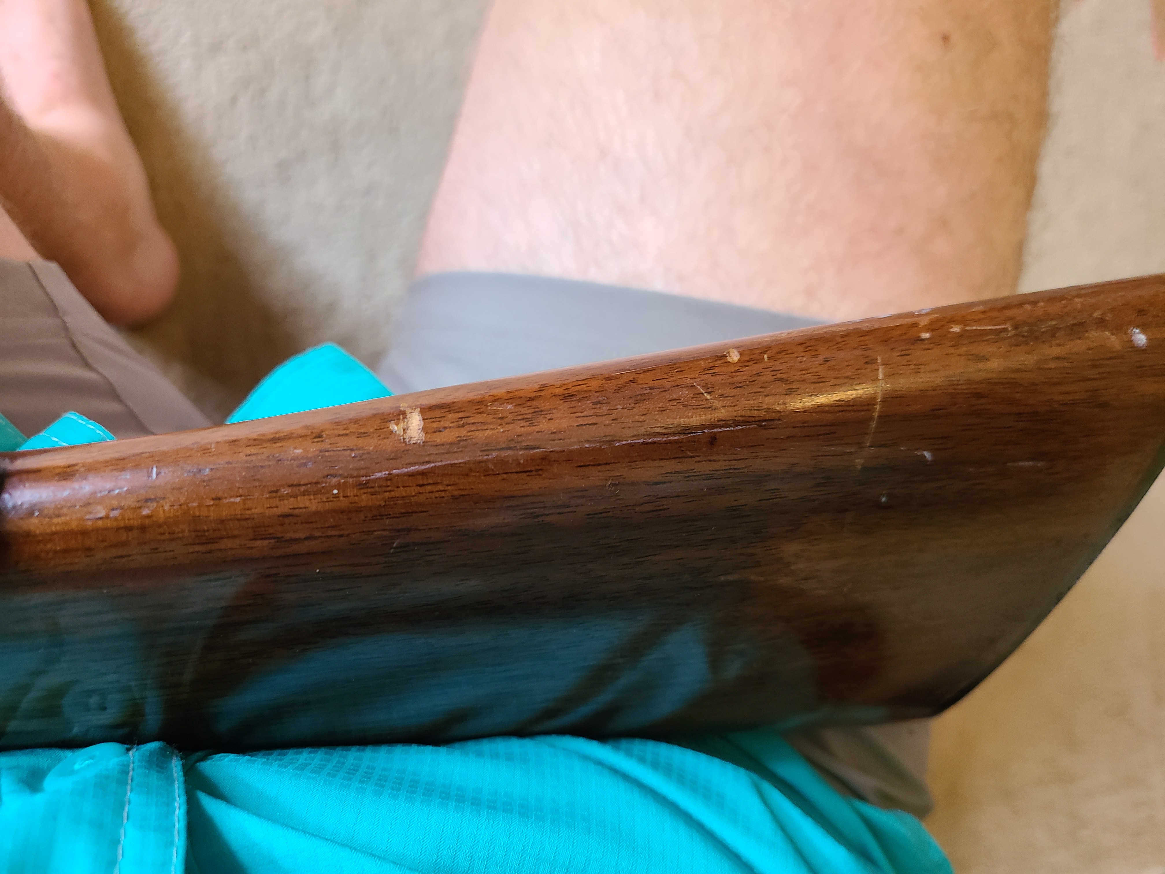 Wood has some dents and scratches but no cracking or splitting. LOP is 14.5" from front trigger to center of butt plate.