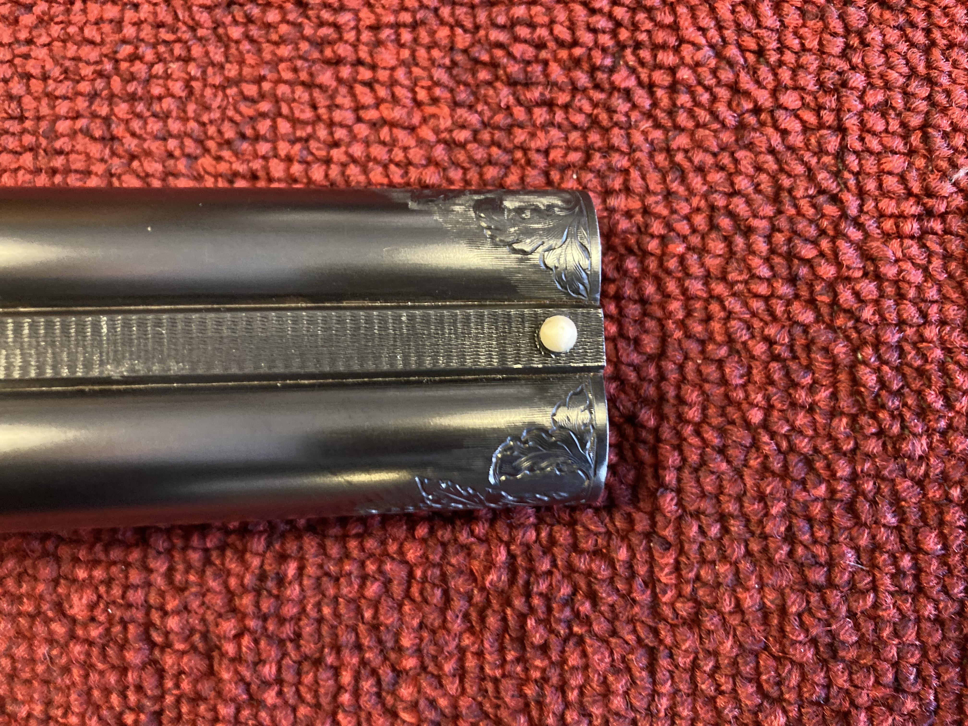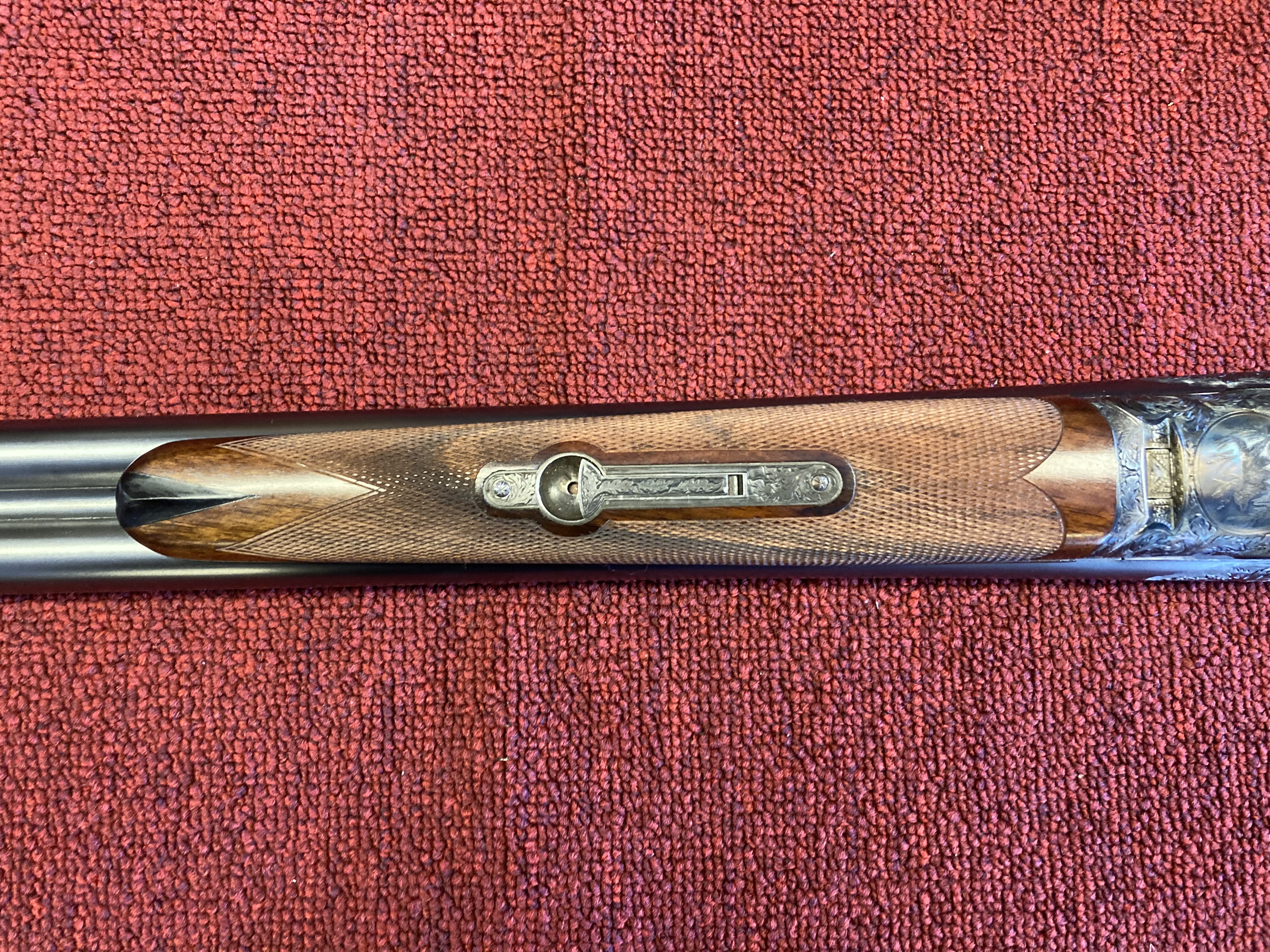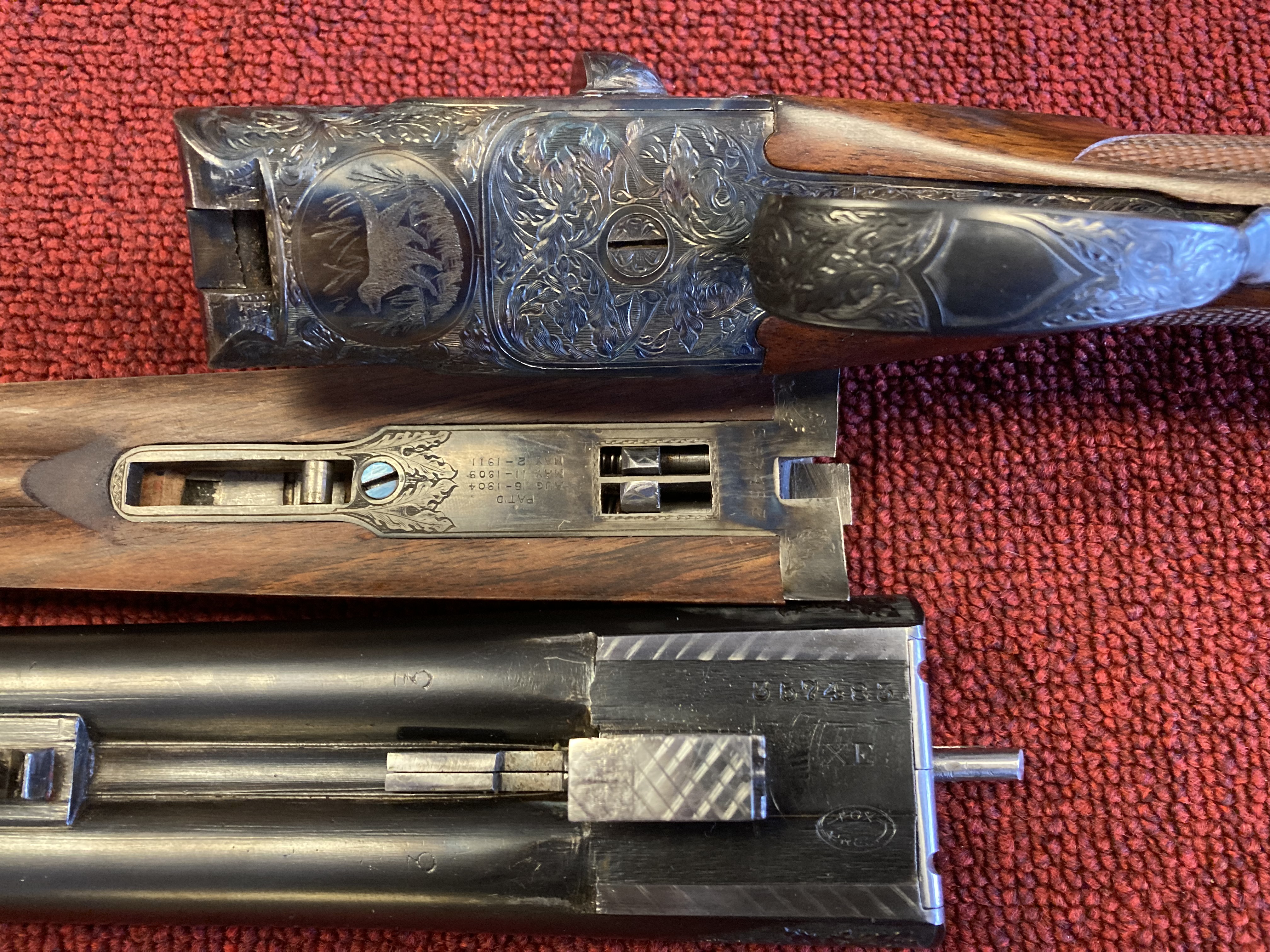 The previous thread and pics of Jolly Bill’s guns done by Jim Demunck got me thinking and really appreciating Mr. Demunck’s work. Here are some pics of an XE upgrade that was done by Jim Demunck and Walter Koulach. Jim did the metal work/engraving and Walter did the furniture. The original owner kept all the documentation, receipts and info between the craftsman and himself for documentation. This gun was completed many years ago and hasn’t left the safe since completion. One interesting aspect of the project is the donor Sterlingworth ejector gun had the traditional friction/snap on forearm. It still retains the snap on forend iron and lug but Mr. Demunck and Mr. Koulach cleverly inletted an A&D style forend latch per the owner’s request. The owner also requested an engraving of his setter on the floor plate instead of the traditional Fox. The fit, finish, stock work, checkering, metal work and engraving is superbly done. It’s a beautiful gun!!! This is not my gun but so enjoyed getting to handle/photograph the gun.
