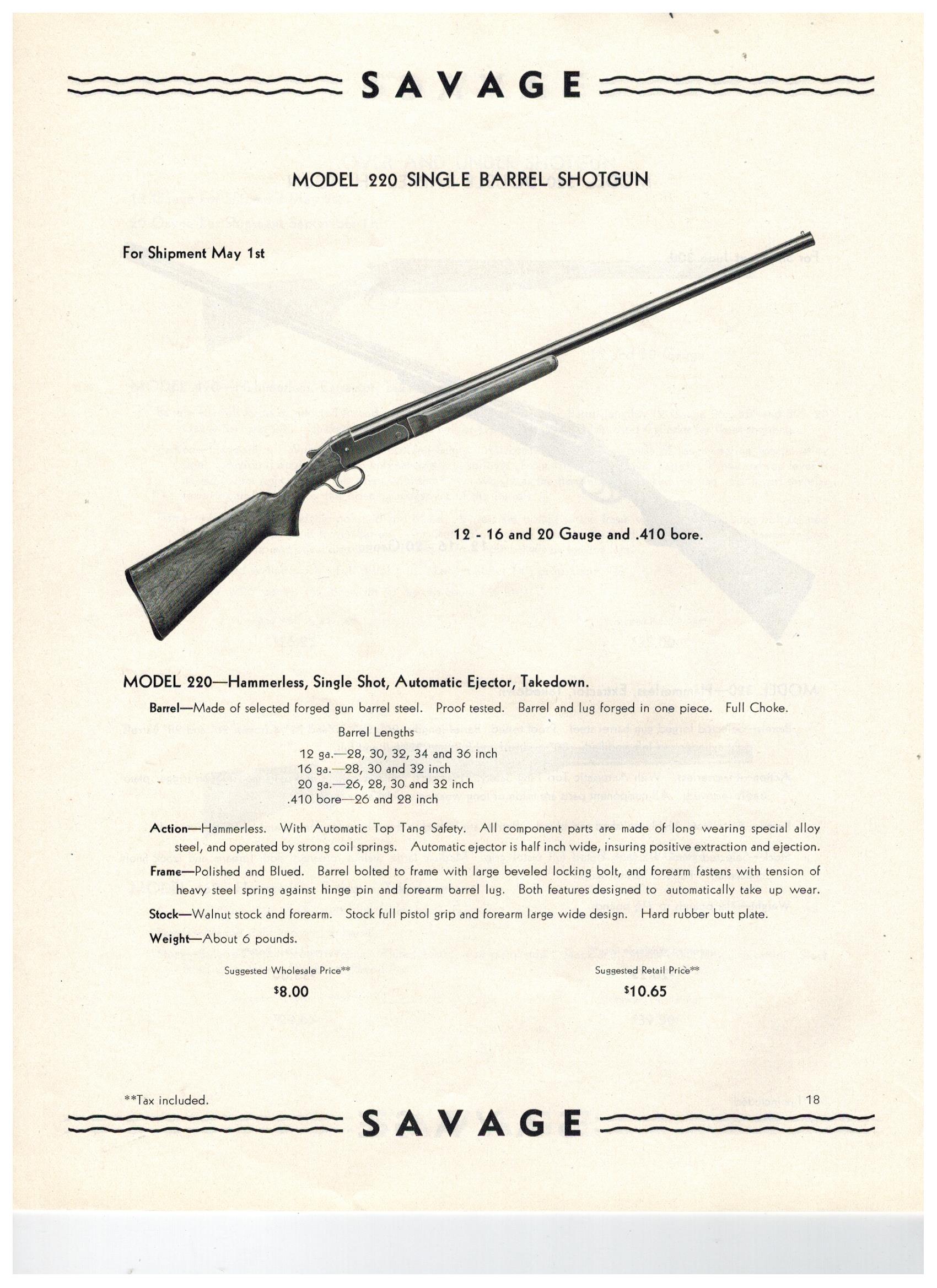 For 1937 Savage Arms Corp. was jumping into the break-action gun market with both feet. They introduced a hammerless single barrel the Model 220 --
