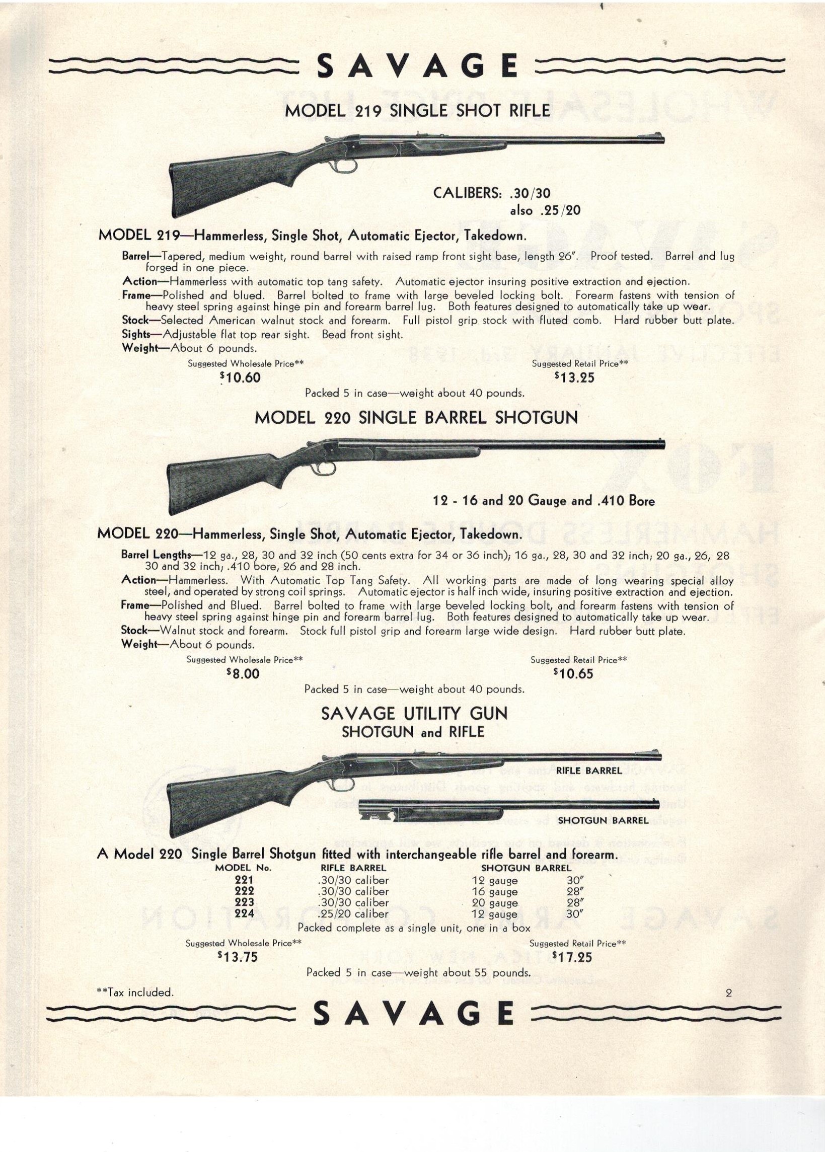 By the January 3, 1938, Wholesale Price List, they added the Model 219 rifle version and a the Savage Utility Gun, two-barrel sets with a shotgun and a rifle barrel --