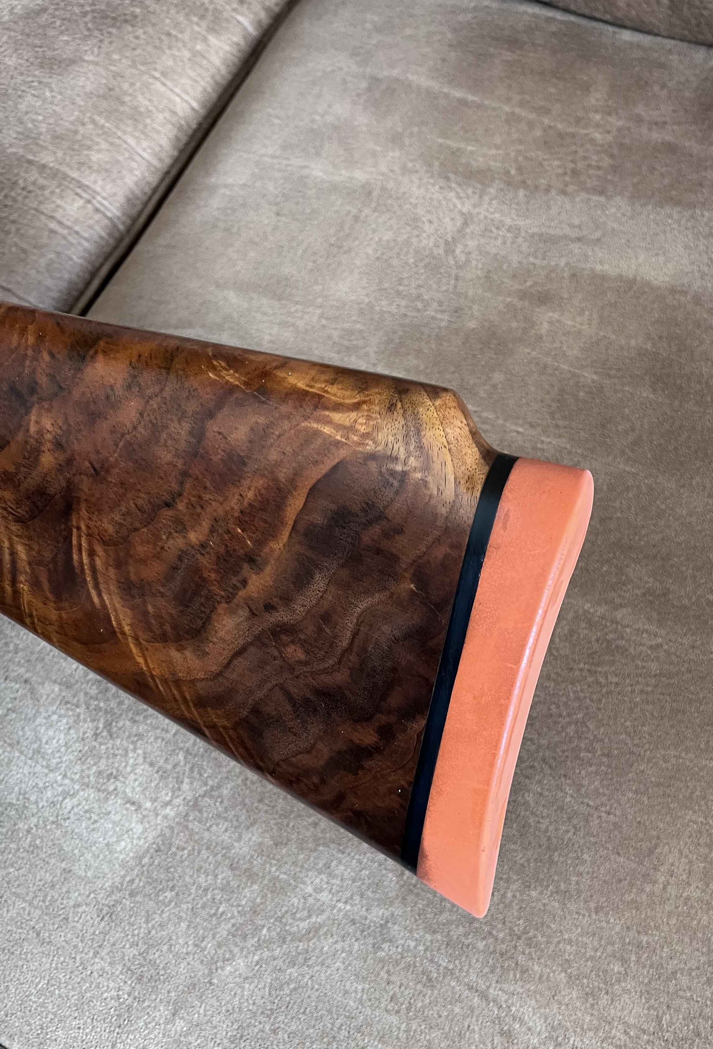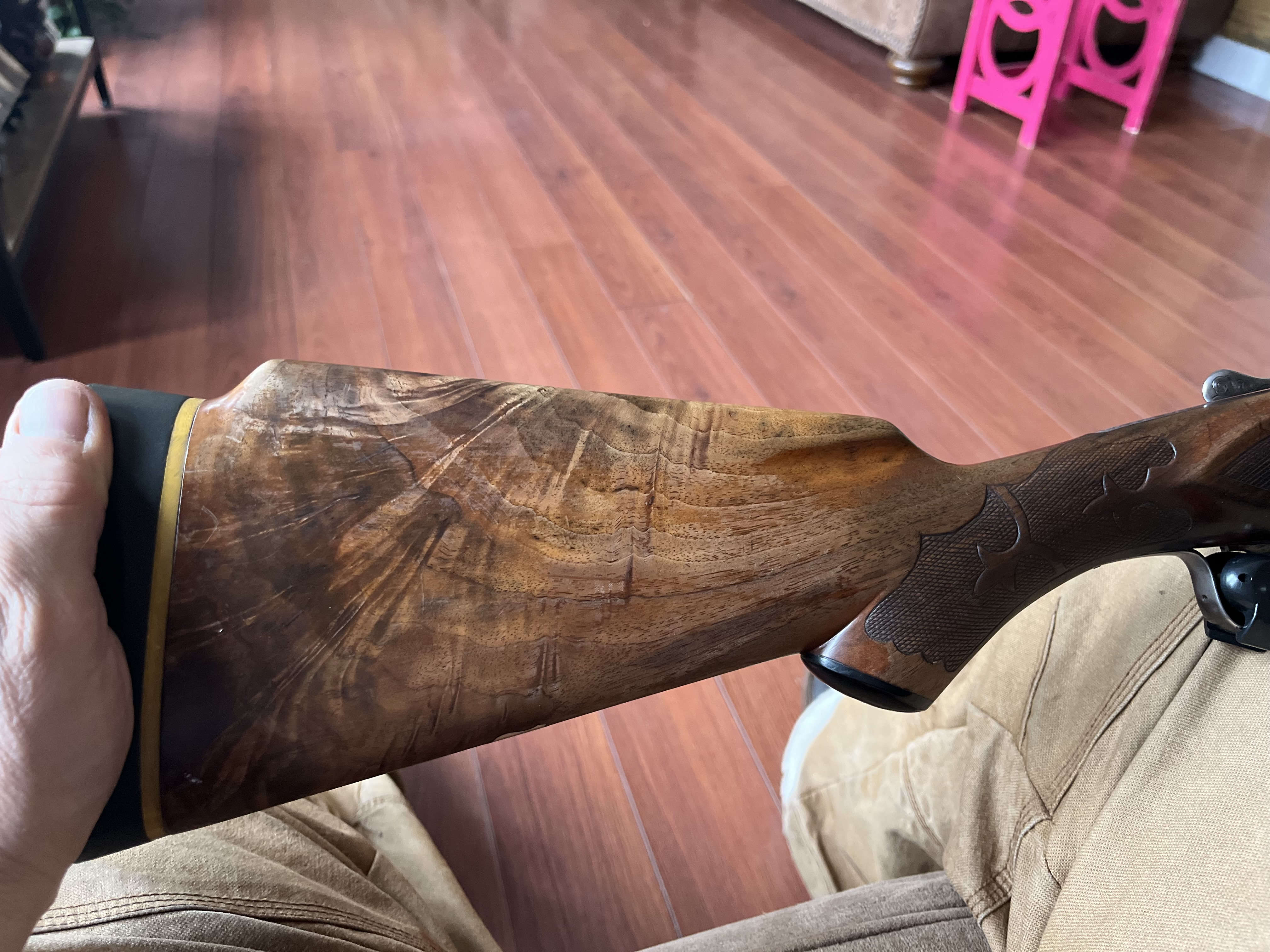 And lastly the previous owner had installed a Jenkins recoil pad, not a great pic of the pad. It was the shape of one of those ugly morgan pads albeit it sure fit the shoulder nicely but it had to go to be replaced with a period correct Silvers repro pad.